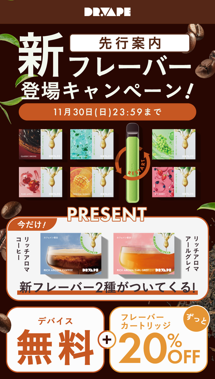 本キャンペーンは期限終了いたしました。 引き続きDR.VAPEをよろしくお願いいたします。 ※このページは数秒後にリダイレクトされます。